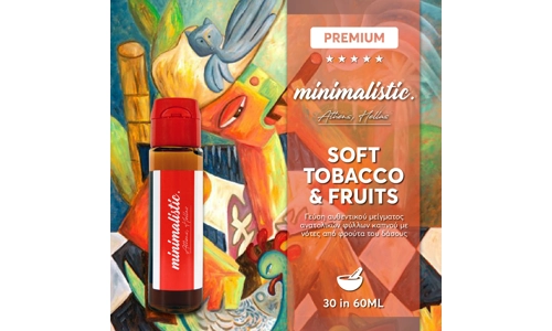 Minimalistic – Mix-Shake-Vape 60ML – Soft Tobacco & Fruits Από πού να ξεκινήσουμε με αυτό; Ίσως από το γεγονός ότι το Soft Tobacco & Fruits είναι μια πραγματικά αξιέπαινη δουλειά που εγκλωβίζει την περιπλοκότητα του γνήσιου Τουρκικού καπνού που έχει υποστεί επεξεργασία στον ήλιο. Είναι ΤΟΣΟ ακριβές το αποτέλεσμα, που γεύεστε ακόμη και αυτό το κορυφαίο, ημίγλυκο φινίρισμα στο στόμα σας. Αυτό είναι το πρώτο μέρος του Soft Tobacco & Fruits, το άλλο αφορά τα φρούτα και τα μούρα. Από την πρώτη εισπνοή καταλαβαίνετε ότι δεν χρησιμοποιήθηκε ένα αόριστο, φρουτένιο εκχύλισμα. Κάθε φρούτο και μούρο ξεχωρίζει, αλλά παράλληλα βρίσκονται σε ισορροπία μεταξύ τους και έτσι δεν κυριαρχεί μία μόνο γεύση. Ο κύκλος του ατμίσματος είναι γεμάτος με ουράνια φρούτα σαν βάση και το άρωμά τους τυλιγμένο γύρω από μια συγκλονιστικά ακριβή και αυθεντική γεύση Τουρκικου καπνού. Συμπέρασμα: το Soft Tobacco & Fruits αξίζει δικαιολογημένα την προσοχή σας!