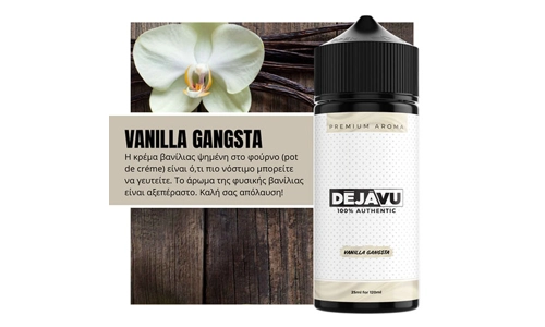 DÉJÀVU Vanilla Gangsta (120ml) Η κρέμα βανίλιας ψημένη στο φούρνο (pot dr creme) είναι ό,τι πιο νόστιμο μπορείτε να γευτείτε. Το άρωμα της φυσικής βανίλιας είναι εξεπέραστο. Καλή σας απόλαυση !